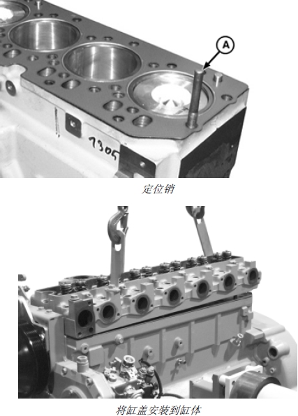 重要提示: 如果缸蓋在缸體上,調整缸蓋位置時(shí)會(huì )損壞缸墊。應通過(guò)安裝和使用定位銷(xiāo) (A) 將缸蓋定位在缸體上。