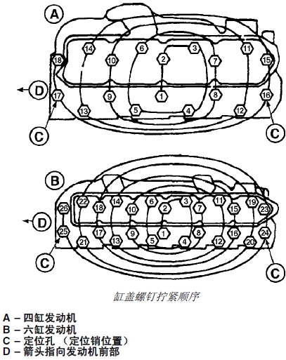 3. 擰緊所有帶帽螺釘(按上面所示位置)直到套筒扳手上的第二個(gè)標記 (B) 與缸蓋上的標記 (C) 對齊為止。