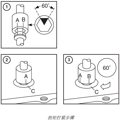 第 4 步-最后-扭矩 . . . . . . 將每個(gè)螺釘再扭轉 60° ± 10°。(參見(jiàn)本章的“用扭矩角度盤(pán)擰至正確扭矩”部分。)