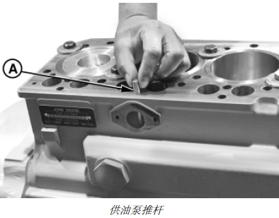 1. 安裝缸蓋前,在供油泵推桿 (A) (如果裝備)上涂抹干凈的John Deere約翰迪爾強鹿柴油發(fā)動(dòng)機潤滑油,然后小心地裝到缸體中。