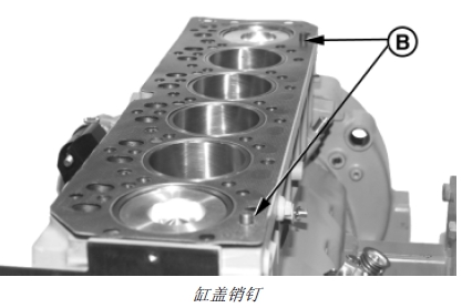 2. 如已拆下,在缸體定位孔中重新裝兩個(gè)定位銷(xiāo)(B)。