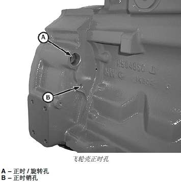 2. 拆下John Deere約翰迪爾強鹿柴油發(fā)動(dòng)機正時(shí)/ 旋轉孔 (A) 和正時(shí)銷(xiāo)孔 (B) 上的塑料塞或蓋板。