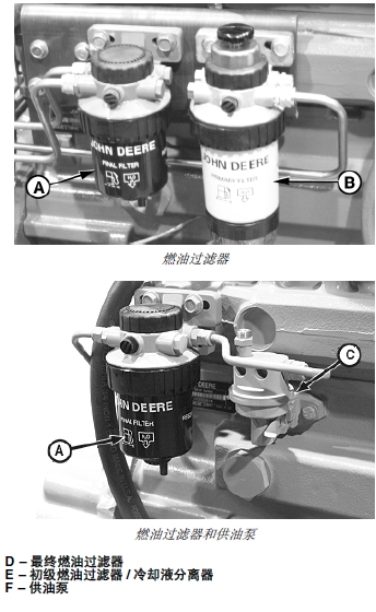 注意: 燃油過(guò)濾器(A) 和(B)、輸油泵(C) 的位置隨John Deere約翰迪爾強鹿柴油發(fā)動(dòng)機和噴油泵型號的不同而有所改變。關(guān)于按要求拆卸過(guò)濾器和/ 或供油泵的步驟,請參見(jiàn) CTM217(機械燃油系統)、CTM179 (配有 Bosch VP44泵的 4 級電子燃油系統)CTM341 (配有Stanadyne DE10 泵的 12 級電子燃油系統)或CTM284 (只有英文版)(配有 Delphi/LucasDP201 泵的 1 級電子燃油系統)的第 02 部分第090 章。