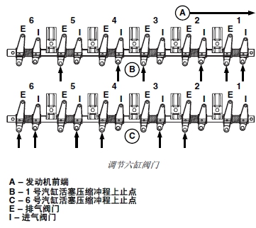4. 調整 2 號、4 號和 6 號汽缸排氣閥門(mén)間隙和 3 號、5號和 6 號汽缸進(jìn)氣閥門(mén)間隙。