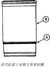 5. 將汽缸套 (B) 上下倒置,并在汽缸套外圈上安裝氯?。ǘ┫鹉z四方形密封圈 (A)。