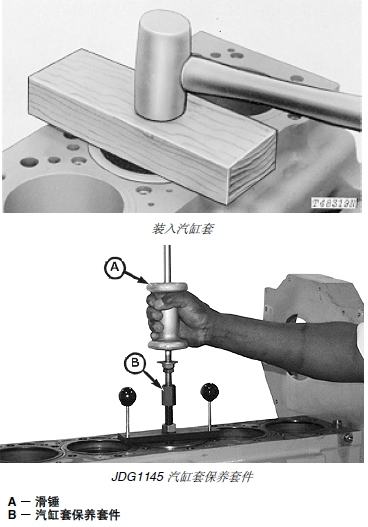 3. 使用上圖所示的干凈硬木塊和錘子或下圖所示的JDG1145 汽缸套保養套件 (B) 和 2.27 千克(5 磅) 滑錘來(lái)完成汽缸套的裝入。