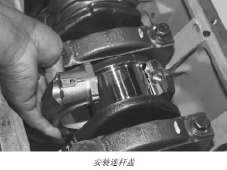 10. 用新帶帽螺釘安裝帶軸瓦的連桿蓋。(有關(guān)安裝和擰緊連桿帶帽螺釘的信息,請參見(jiàn)第 030 章的“安裝活塞和連桿”部分。)