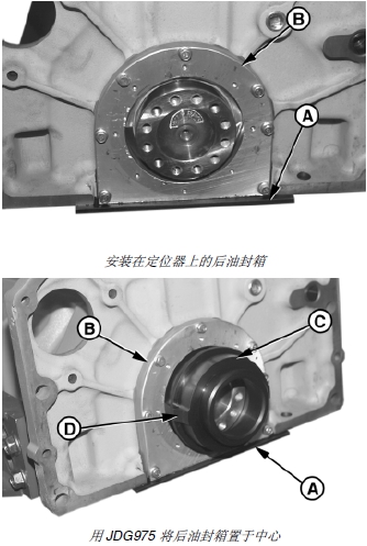 3. 將 JDG975 正時(shí)齒輪室蓋/ 后油封箱定位器 (C) 較大的一端安裝曲軸后凸緣上,錐形定位器 (D) 應位于時(shí)鐘 3 點(diǎn)和 9 點(diǎn)的位置。