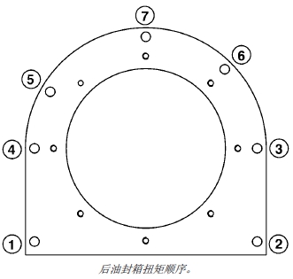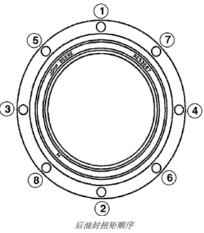 注意: 為了與曲軸箱對準,在安裝后油封箱前先應從油盤(pán)襯墊底部清潔所有的墊圈材料和密封劑。曲軸凸緣的外徑和后油封箱的內徑一定不可有刻痕和毛刺。用砂布修復磨損表面,并將表面徹底清潔干凈。