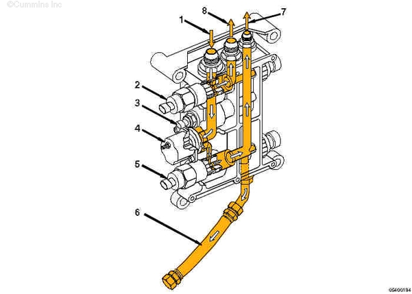 1. 燃油泵側燃油進(jìn)口 2. 燃油正時(shí)執行器 3. 燃油溫度傳感器 4. 燃油切斷閥 5. 燃油油軌執行器 6. 燃油油軌阻尼管 7. 燃油到燃油油軌 8. 燃油到燃油正時(shí)。 | |||