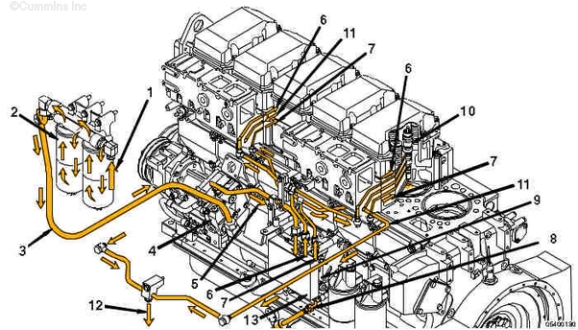 1. 油箱側燃油進(jìn)口 2. 帶水分離器的燃油濾清器 3. 燃油泵進(jìn)口管 4. 燃油泵 5. 燃油控制閥供油管 6. 燃油正時(shí)供油管 7. 燃油油軌供油管 8. 燃油油軌阻尼管 9. 電子燃油控制閥總成 10. 噴油器 11. 燃油回油管 12. 燃油回油(發(fā)動(dòng)機到油箱) 13. ECM。