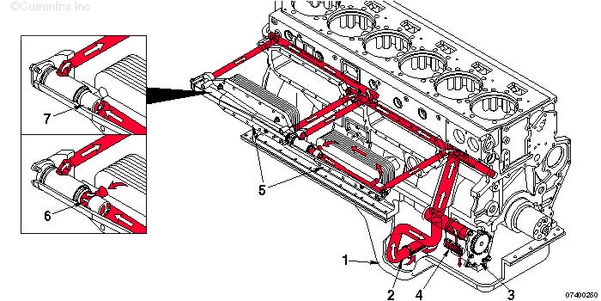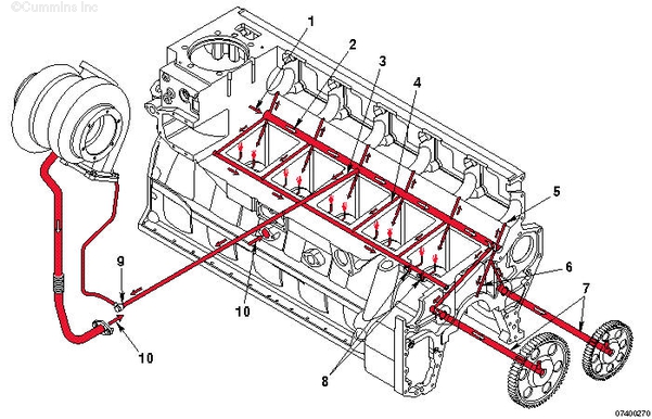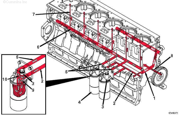 1. 來(lái)自濾清器的機油流 2. 主油道 3. 至渦輪增壓器供油管的油道 4. 至活塞冷卻噴嘴油道的油道 5. 至凸輪軸襯套和缸蓋的機油 6. 至主軸承和曲軸的機油 7. 至前惰輪的機油 8. 至活塞冷卻噴嘴的機油 9. 渦輪增壓器供油管 10. 渦輪增壓器機油流回曲軸箱。