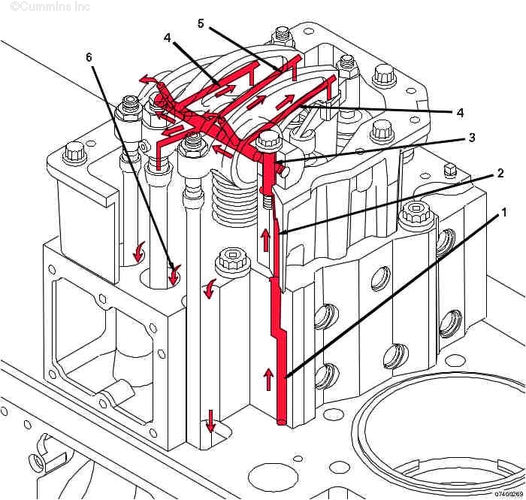 1. 流過(guò)缸蓋的機油 2. 流過(guò)搖臂室殼體的機油 3. 流經(jīng)搖臂軸螺栓周?chē)屯ㄟ^(guò)搖臂軸的機油 4. 流過(guò)搖臂的機油 5. 流過(guò)噴油器搖臂的機油 6. 機油流回油底殼。 | ||||||