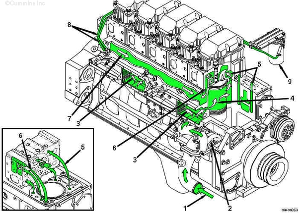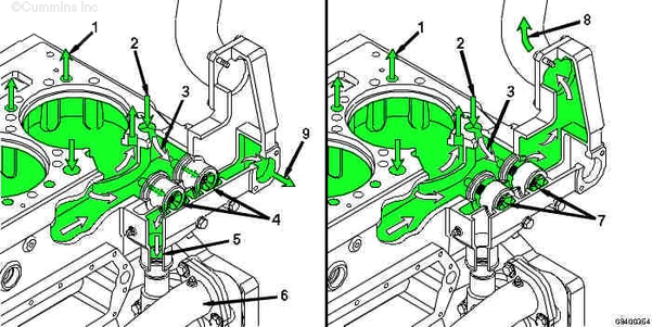 1. 來(lái)自散熱器的冷卻液進(jìn)口 2. 水泵 3. 流過(guò)機油冷卻器的冷卻液 4. 流經(jīng)缸套周?chē)睦鋮s液 5. 至缸蓋的冷卻液 6. 從缸蓋至冷卻液歧管的冷卻液 7. 冷卻液歧管至節溫器殼體 8. 冷卻液濾清器供油和回流管 9. 冷卻液濾清器。