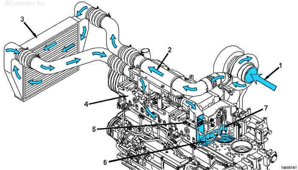1. 至渦輪增壓器的進(jìn)氣口 2. 渦輪增壓后的空氣至空-中冷器 3. 空-空中冷器 4. 進(jìn)氣歧管 5. 格柵加熱器(僅限于工業(yè)用) 6. 缸蓋進(jìn)氣口 7. 進(jìn)氣門(mén)。 | ||