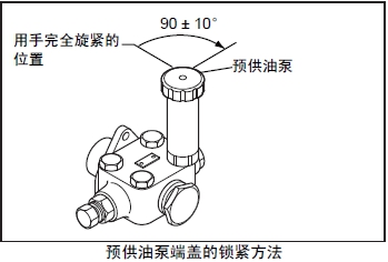 (3) 從放氣塞內排出的燃油不含有氣泡時(shí)旋緊塞頭,但在旋緊最后的1個(gè)放氣塞前,先將預供油油泵的端蓋壓下向右旋回至原狀鎖定。