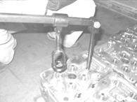 把氣門(mén)彈簧壓縮器(WPT011)螺紋連接端旋入圖中箭頭所指處,然后把氣門(mén)彈簧壓縮器(WPT011)的壓頭壓在氣門(mén)彈簧上,手握住手柄,并下壓,直到手柄桿為水平狀態(tài),此時(shí)方可安裝氣門(mén)鎖夾。