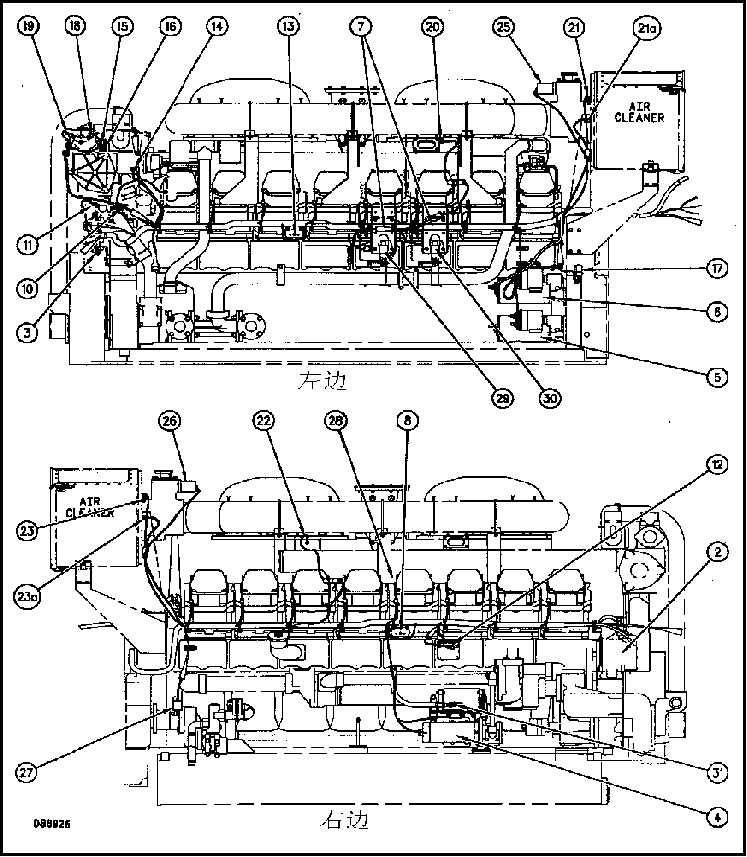 2.充電機 3.發(fā)動(dòng)機電控器,4.預潤滑馬達, 5.起動(dòng)馬達,6.起動(dòng)馬達 7.電阻器,8.充電機斷路器.10.后冷卻器溫度傳感器.11.大氣壓力傳感器.12.曲軸箱壓力傳感器.13.發(fā)動(dòng)機電控器(ECM)斷路器.14.發(fā)動(dòng)機冷卻液溫度傳感器.15. 已過(guò)濾機油壓力傳感器.16. 未過(guò)濾機油壓力傳感器.17.發(fā)動(dòng)機正時(shí)\轉速傳感器.18.燃油濾清器壓力傳感器(已過(guò)濾).19.燃油濾清器壓力傳感器(未過(guò)濾).20.左排氣溫度傳感器.21.左渦輪增壓進(jìn)氣壓力傳感器.22.右排氣溫度傳感器.23.右渦輪增壓進(jìn)氣壓力傳感器.24.渦輪增壓氣輸入壓力傳感器.25.空氣關(guān)斷電磁閥(左,選配件).26.空氣關(guān)斷電磁閥(右,選配件).28.噴油器電磁閥 29.輔助起動(dòng)電磁閥.30.輔助起動(dòng)電磁閥.31.預潤滑壓力開(kāi)關(guān)(選配件).