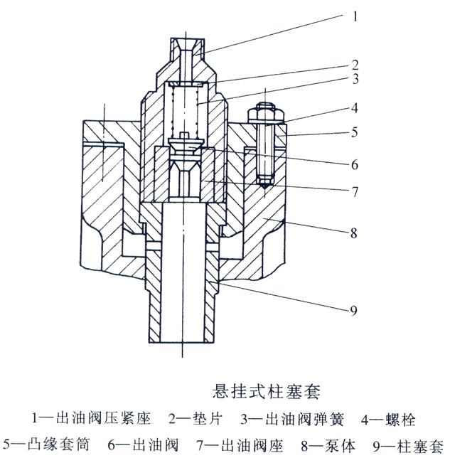 P型噴油泵懸掛式分泵柱塞套結構與工作原理、寧南汽配城賣(mài)康明斯配件皮帶零件查詢(xún)船用柴油機配件附近哪里有珀金斯發(fā)動(dòng)機換四配套, 柱塞套9和出油閥6、出油閥座7都在凸緣套筒5內,并利用出油閥壓緊座1擰緊,使它成為一個(gè)獨立的組件。然后用兩個(gè)螺栓將凸緣套筒固定在泵體頂端面上,形成一種懸掛式結構。在出油閥壓緊座擰緊后,柱塞套僅僅是上部臺肩承受壓力,而進(jìn)、回油孔部位都不受力,從而避免了柱塞套在進(jìn)、回油處受壓變形。