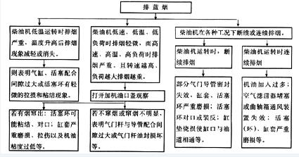 主要特征是,低溫排煙嚴重,溫度升高后排煙減輕或消失;中小負荷排煙輕微,大負荷高速時(shí)排煙嚴重;各種轉速工況下斷續或連續排煙(參見(jiàn)“排藍煙”框圖)。
