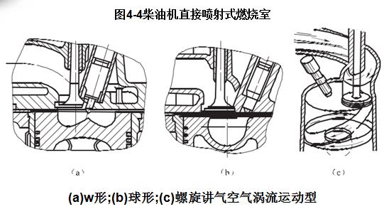 直接噴射式燃燒室常見(jiàn)的結構形式(如圖4 -4所示)是由凹形活塞頂與汽缸蓋底面所包圍的空間組成,也稱(chēng)統一式燃燒室。幾乎全部燃燒室容積都在活塞頂面上,按活塞頂面形狀不同,又可分為ω形、球形等。