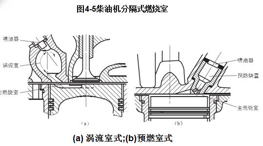 分隔式燃燒室由兩部分組成:一部分位于活塞頂與汽缸蓋底面之間,稱(chēng)為主燃燒室;另一部分在汽缸蓋中,稱(chēng)為副燃燒室。兩部分之間有一個(gè)或幾個(gè)孔道相連。分隔式燃燒室常見(jiàn)的形式有渦流室式和預燃室式兩種,如圖4-5所示。