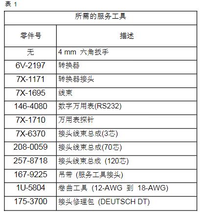 卡特電氣服務(wù)工具被設計用來(lái)幫助服務(wù)工程師完成以下任務(wù):• 獲得信息• 分析系統• 系統校準• 系統設置• 數據鏈路通訊所需的服務(wù)工具表1列出的工具是服務(wù)工程師完成本手冊上的測試程序所需要的。