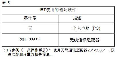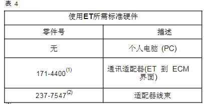 注意:更多卡特ET的使用信息和對應計算機配置需求,請參閱卡特ET軟件的相關(guān)文檔。連接ET用通訊適配器II連接表4列出連接卡特ET所需要的標準硬件。