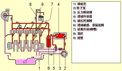 壓力潤滑 對負荷大,相對運動(dòng)速度高的摩擦面,例如:主軸承、連桿軸承、凸輪軸軸承和氣門(mén)搖臂軸(因位置偏高)等都利用機油泵采用潤滑強度較大的壓力潤滑。