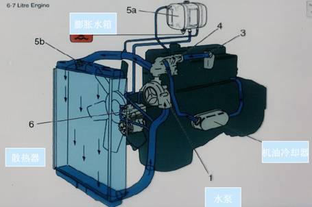 • 工程機械發(fā)動(dòng)機上應用最普遍的是強制循環(huán)式水冷卻系,它由水泵潤滑油冷卻器、變速箱冷卻器、節溫器、缸蓋、缸體、散熱器進(jìn)水管、水泵進(jìn)水口、散熱器、補液箱、風(fēng)扇等構成。水泵通過(guò)水管從散熱器內吸入低溫水,使冷卻水在發(fā)動(dòng)機缸體和缸蓋的水道中不停地循環(huán)流動(dòng),冷卻水吸收熱量后又流回散熱器。風(fēng)扇使空氣高速流過(guò)散熱器,將散熱器中水地熱量散發(fā)到空氣中去。
