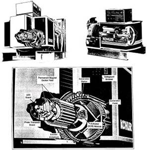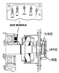 LED裝在發(fā)電機軸的端部,對著(zhù)在軸上旋轉的光敏晶體管。光敏晶體管接收來(lái)自L(fǎng)ED的信號,按要求比如調壓器的指令來(lái)指示SCR旋轉橋開(kāi)通或關(guān)斷。