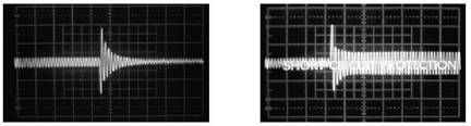 耐受短路電流能力 一臺工作在滿(mǎn)負荷下的發(fā)電機組3相對稱(chēng)短路——最嚴重的情況——顯示在兩示波器屏幕上。左邊的軌跡顯示工作在額定電流下的常規無(wú)刷發(fā)電機在短路時(shí),由沖擊電流逐漸減少至低于額定電流。右邊屏幕上的軌跡顯示的是額定值一樣的快速響應Ⅱ發(fā)電機,工作在同樣情況下,其電流升高至超出其額定水平,從而能夠跳開(kāi)支路斷路器。