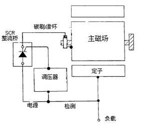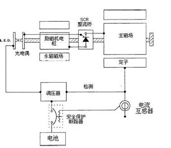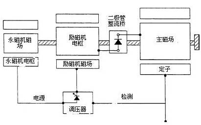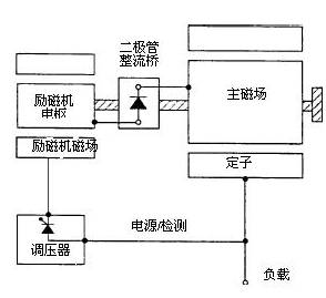 該系統采用繞制的勵磁電樞,它與主磁場(chǎng)同軸旋轉。通過(guò)將主發(fā)電機的交流輸出的一小部分整流,調壓器給勵磁機磁場(chǎng)提供可調的直流電源。