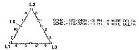 對△形連接最普通的電壓是120/240或110/220。一半的相電壓可由串接繞組和線(xiàn)之間得到。(L1-L0)