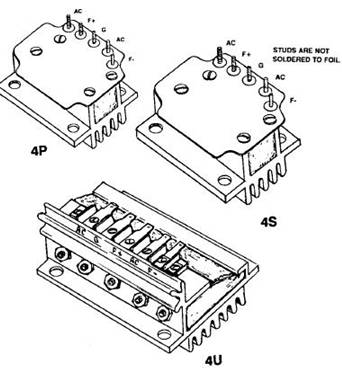 模塊包含2個(gè)SCR(可控硅)和兩個(gè)二極管,連接成一橋形。一個(gè)自由旋轉的二極管和變阻器跨接在輸出端(F+ F-)上以保護橋路。