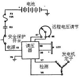 調壓器檢測發(fā)電機的輸出電壓,并按輸出電壓的幅度使固定的LED(發(fā)光二極管)亮或者滅。調壓器的電源由發(fā)電機組電池提供。