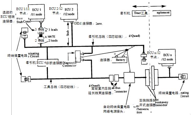 ECU2通過(guò) ECU n 為 J1939/12 兼容的節點(diǎn)并顯示出它們同主干線(xiàn)的連接。 | |||||
