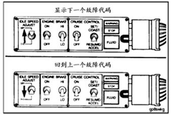 在指令系統開(kāi)始其它操作之前,指示燈將一直閃爍同一個(gè)故障代碼。要想顯示下一個(gè)故障代碼,暫時(shí)把IDLE SPEED ADJUST開(kāi)關(guān)扳到“(+)”位置,要想回到上一個(gè)故障代碼,把IDLE SPEED ADJUST開(kāi)關(guān)暫時(shí)扳到“(-)”位置即可。如果只有一個(gè)現行故障,不論開(kāi)關(guān)扳到“(+)”或“(-)”,系統都將連續顯示同一個(gè)故障代碼。