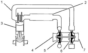 (1) 排氣岐管 (2)后冷器(3)發(fā)動(dòng)機氣缸 (4)進(jìn)氣口 (5)渦輪增壓器壓縮機葉輪(6)渦輪坩壓器堝輪葉鞋(7)排氣出口