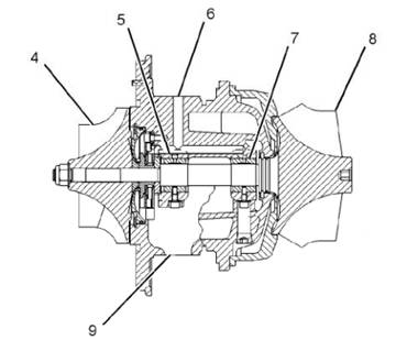 (4)壓縮機葉輪 (5)軸承 (6)機油進(jìn)口 (7)軸承 (8)渦輪機葉輪 (9)出油口