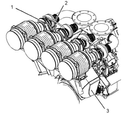 Perkins4016柴油發(fā)動(dòng)機在發(fā)動(dòng)機后端安裝了四個(gè)渦輪增壓器(1)。每個(gè)渦輪增壓囂的渦輪機側都連接至該渦輪增壓器的排氣歧管。每個(gè)渦輪增壓器的壓縮機側都通過(guò)管道與后冷器殼體相連。