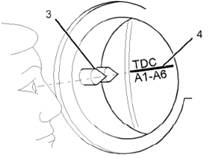 5使用工具(A)旋轉曲軸,使飛輪上相應的標記(4)與指針(3)對齊。確保搖臂和連接件之間存在間隙。