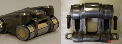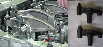 帶導向、可調整的氣門(mén)過(guò)橋實(shí)現一個(gè)搖臂驅動(dòng)兩個(gè)氣門(mén)。