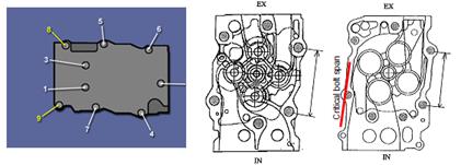 康明斯Cummins QSK23發(fā)動(dòng)機有7條螺栓擰緊缸蓋的燃燒室區域。這使得氣缸能密封200 Bar壓力并將缸套扭曲維持在最小。兩個(gè)小一點(diǎn)的缸蓋螺栓用于密封推桿腔。
