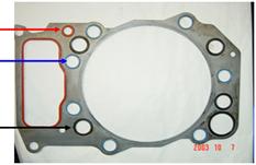 康明斯Cummins QSK23發(fā)動(dòng)機缸墊的通道針對內部流動(dòng)的不同流體使用不同的密封材料。 紅色的密封機油通道, 黑色的密封冷卻液通道, 藍色的密封缸蓋螺栓周?chē)?/P>