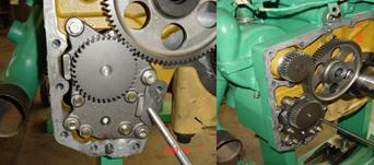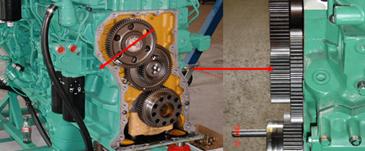 康明斯Cummins QSK23發(fā)動(dòng)機后齒輪系驅動(dòng)凸輪軸。 一個(gè)復合惰齒輪提供所需的速度降。這種布置提供了更小的噪音及更精確的噴油正時(shí)控制。