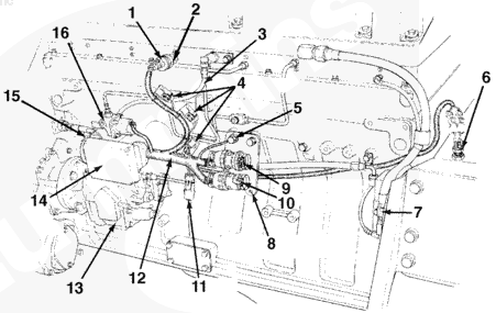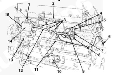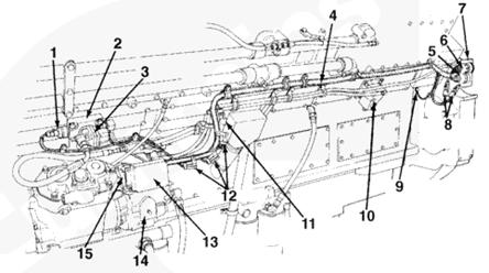 1油軌壓力傳感器,2燃油連接塊,3燃料切斷閥4發(fā)動(dòng)機線(xiàn)束,5  C6 接頭,6  C5 接頭,7  OEM C5 和 C6 接頭支架,8發(fā)動(dòng)機轉速傳感器,9系統接地接頭,10液壓機械式 STC 執行器,11發(fā)動(dòng)機側數據通信接頭,12保險絲 (5A),13  ECM,14燃油泵,15電子燃油控制閥。