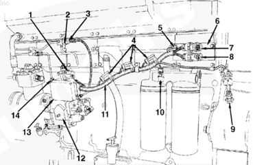 1油軌壓力傳感器,2燃油連接塊,3空燃比控制傳感器管,4保險絲 (5A),5系統接地接頭,6發(fā)動(dòng)機轉速傳感器,7液壓機械式 STC 執行器,8  OEM C5 和 C6 接頭支架,9  C5 接頭,10  C6 接頭,11發(fā)動(dòng)機側數據通信接頭,12發(fā)動(dòng)機線(xiàn)束,13燃油泵,14 ECM,15電子燃料控制閥,16燃油切斷閥,