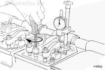 擰緊調節螺釘,直到康明斯噴油器柱塞到達油杯底部。將千分表歸零。前后轉動(dòng)調節螺釘 2 到 3 次,確認歸零設置。