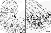 這種調節可從任一氣門(mén)設置標記開(kāi)始。在插圖中,假設 1R-6R 或 1R-8R 標記已經(jīng)對準,且右排 1 號缸上的氣門(mén)已經(jīng)關(guān)閉,可以開(kāi)始調整調節螺釘高度。